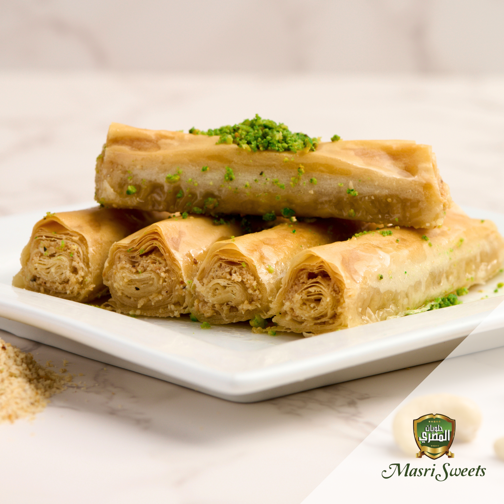 Ground Cashews in between layers of crunchy phyllo dough baked to a golden brown topped with Sugar Free syrup.
